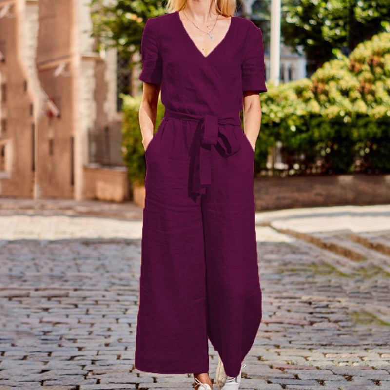 Women's short sleeve jumpsuit jumpsuit summer casual V-neck pocket overalls jumpsuit short sleeve wide leg loose jumpsuit